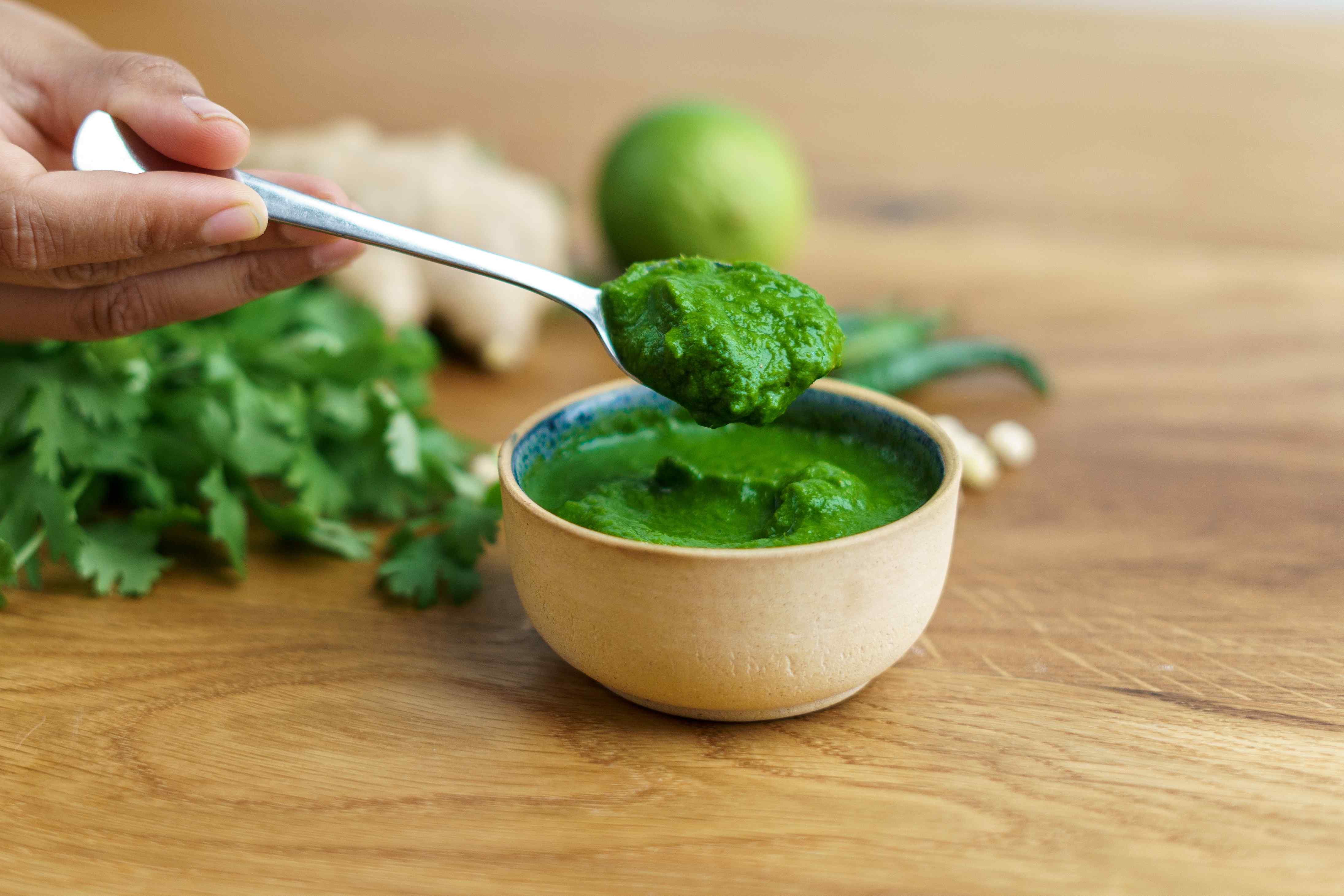 'Hari' or green chutney is a herby, fresh and tangy chutney made with fresh coriander and mint. This chutney is perfect to dip samosas, pakoras and kebabs. It's also great as a spread for sandwiches and wraps. Often paired with sweet and sour tamarind chutney, this savoury, zesty and refreshing chutney is an important ingredient in North Indian street food and 'chaat'.